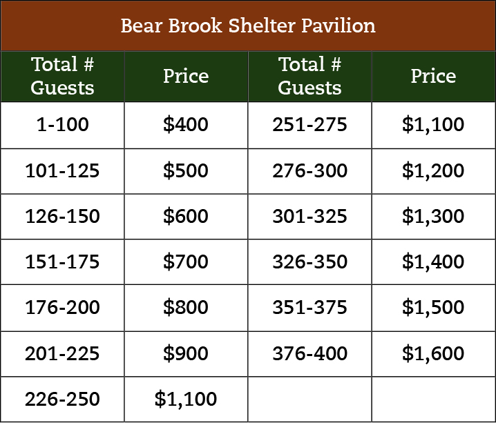 The minimum upfront cost to reserve the pavilion is $400. The park will contact you via e-mail to collect any balance due and provide important information, including any additional permits that may be required. Please contact park staff at bearbrookstatepark@dncr.nh.gov with any questions.