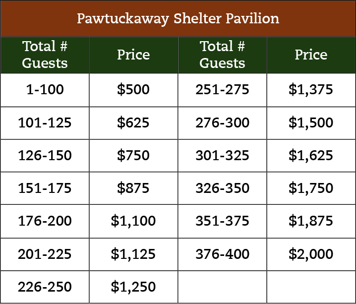 The minimum upfront cost to reserve the pavilion is $500. Please contact park staff at pawtuckawaysp@dncr.nh.gov with any questions.